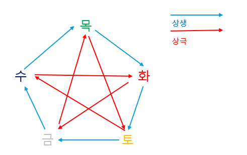 이처럼 오행이 극을 하는 순서는 木 -> 土 -> 水 -> 火 -> 金 -> 木 입니다.